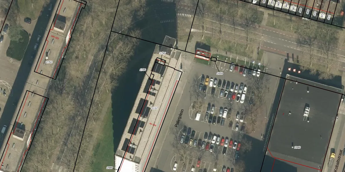 Het perceel waarop Paletplein 59 staat heeft een oppervlakte van 1067 m². Dit is een zeer groot perceel. De perceeloppervlakte wordt geregistreerd door het Kadaster. Gedetailleerde informatie over de maten van dit perceel kunt u vinden in het rapport Kadastrale kaart met maatvoering van Paletplein 59.