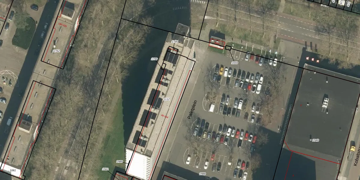 Het perceel waarop Paletplein 60 staat heeft een oppervlakte van 1067 m². Dit is een zeer groot perceel. De perceeloppervlakte wordt geregistreerd door het Kadaster. Gedetailleerde informatie over de maten van dit perceel kunt u vinden in het rapport Kadastrale kaart met maatvoering van Paletplein 60.