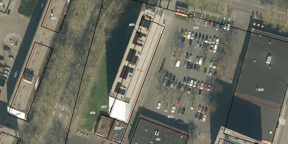 Het perceel waarop Paletplein 62 staat heeft een oppervlakte van 1067 m². Dit is een zeer groot perceel. De perceeloppervlakte wordt geregistreerd door het Kadaster. Gedetailleerde informatie over de maten van dit perceel kunt u vinden in het rapport Kadastrale kaart met maatvoering van Paletplein 62.