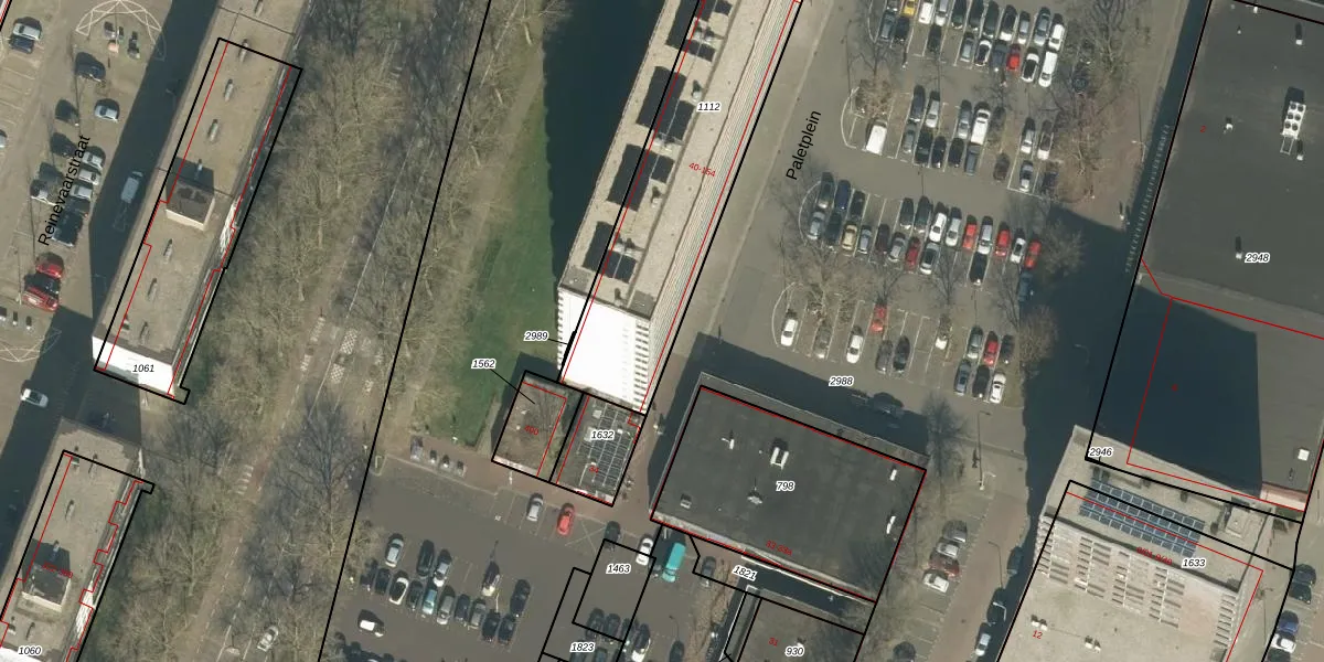 Het perceel waarop Paletplein 65 staat heeft een oppervlakte van 1067 m². Dit is een zeer groot perceel. De perceeloppervlakte wordt geregistreerd door het Kadaster. Gedetailleerde informatie over de maten van dit perceel kunt u vinden in het rapport Kadastrale kaart met maatvoering van Paletplein 65.