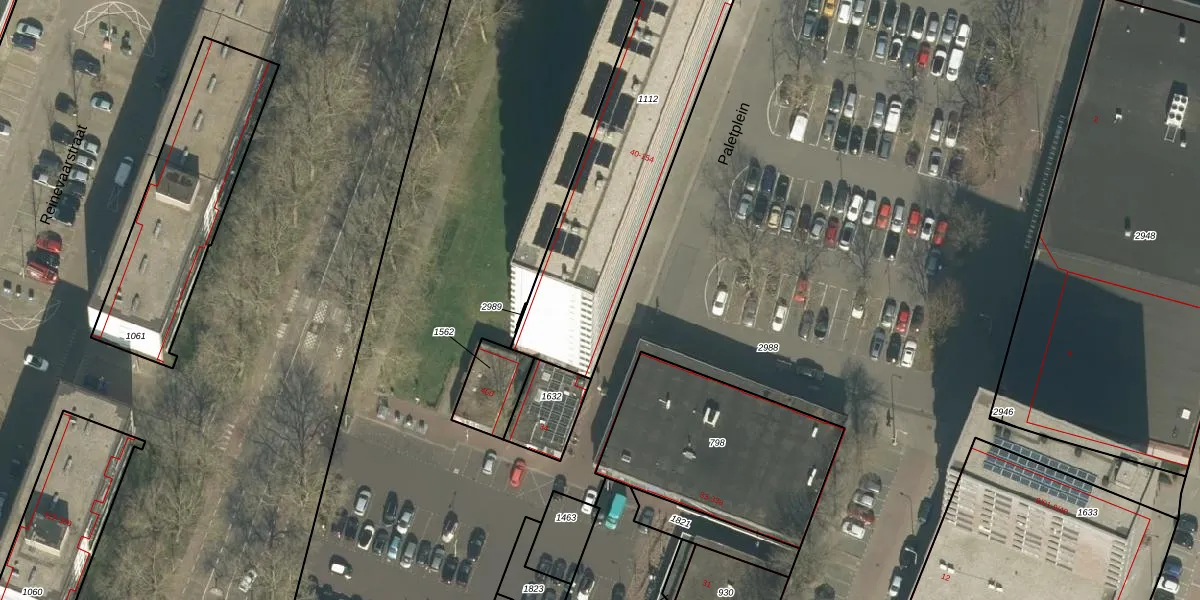 Het perceel waarop Paletplein 68 staat heeft een oppervlakte van 1067 m². Dit is een zeer groot perceel. De perceeloppervlakte wordt geregistreerd door het Kadaster. Gedetailleerde informatie over de maten van dit perceel kunt u vinden in het rapport Kadastrale kaart met maatvoering van Paletplein 68.