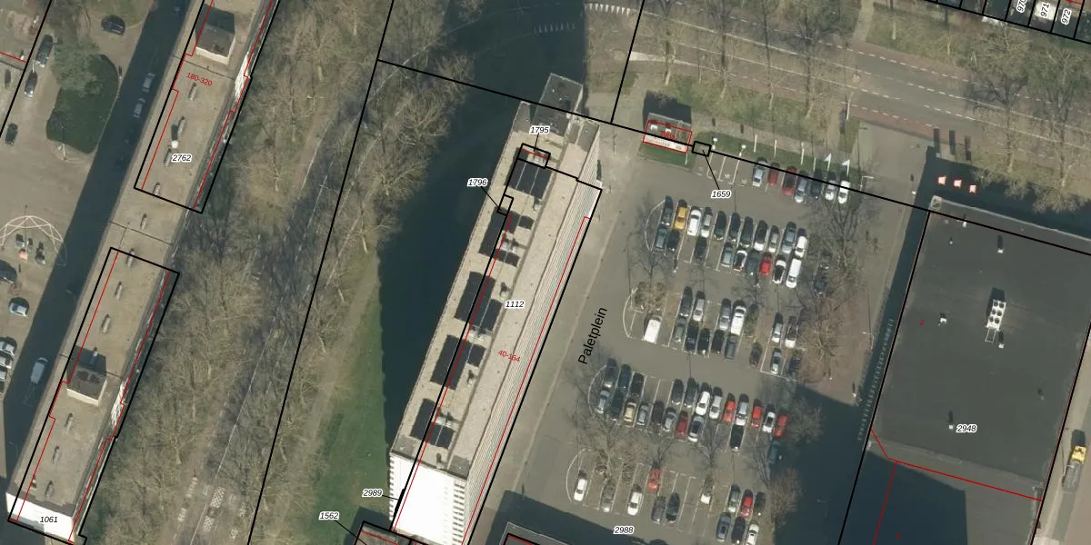 Het perceel waarop Paletplein 76 staat heeft een oppervlakte van 1067 m². Dit is een zeer groot perceel. De perceeloppervlakte wordt geregistreerd door het Kadaster. Gedetailleerde informatie over de maten van dit perceel kunt u vinden in het rapport Kadastrale kaart met maatvoering van Paletplein 76.