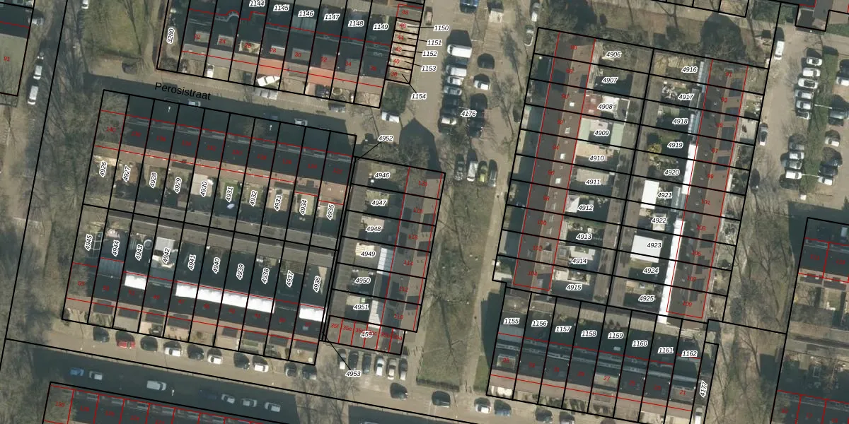 Perosistraat 118 is gelegen op kadastraal perceel TBG01S4947. Deze kadastrale aanduiding is uniek en wordt gebruikt door het Kadaster om eigendomsrechten en andere zakelijke rechten vast te leggen. Het perceel maakt onderdeel uit van de kadastrale gemeente Tilburg.