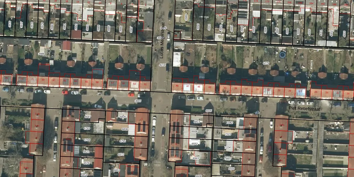 Het perceel waarop Piet Retiefstraat 49 staat heeft een oppervlakte van 3258 m². Dit is een zeer groot perceel. De perceeloppervlakte wordt geregistreerd door het Kadaster. Gedetailleerde informatie over de maten van dit perceel kunt u vinden in het rapport Kadastrale kaart met maatvoering van Piet Retiefstraat 49.