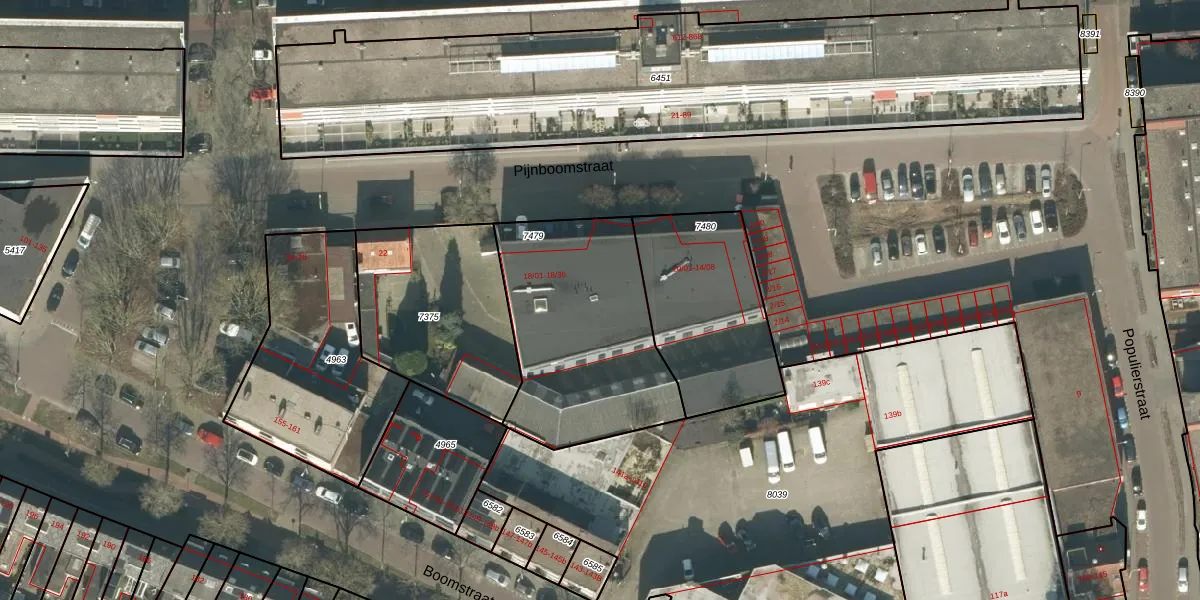 Pijnboomstraat 18-33 is gelegen op kadastraal perceel TBG01P7479. Deze kadastrale aanduiding is uniek en wordt gebruikt door het Kadaster om eigendomsrechten en andere zakelijke rechten vast te leggen. Het perceel maakt onderdeel uit van de kadastrale gemeente Tilburg.