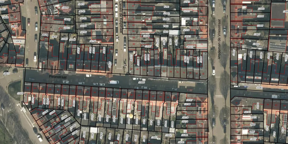 Het perceel waarop Pironstraat 43 staat heeft een oppervlakte van 85 m². Dit is een klein perceel. De perceeloppervlakte wordt geregistreerd door het Kadaster. Gedetailleerde informatie over de maten van dit perceel kunt u vinden in het rapport Kadastrale kaart met maatvoering van Pironstraat 43.