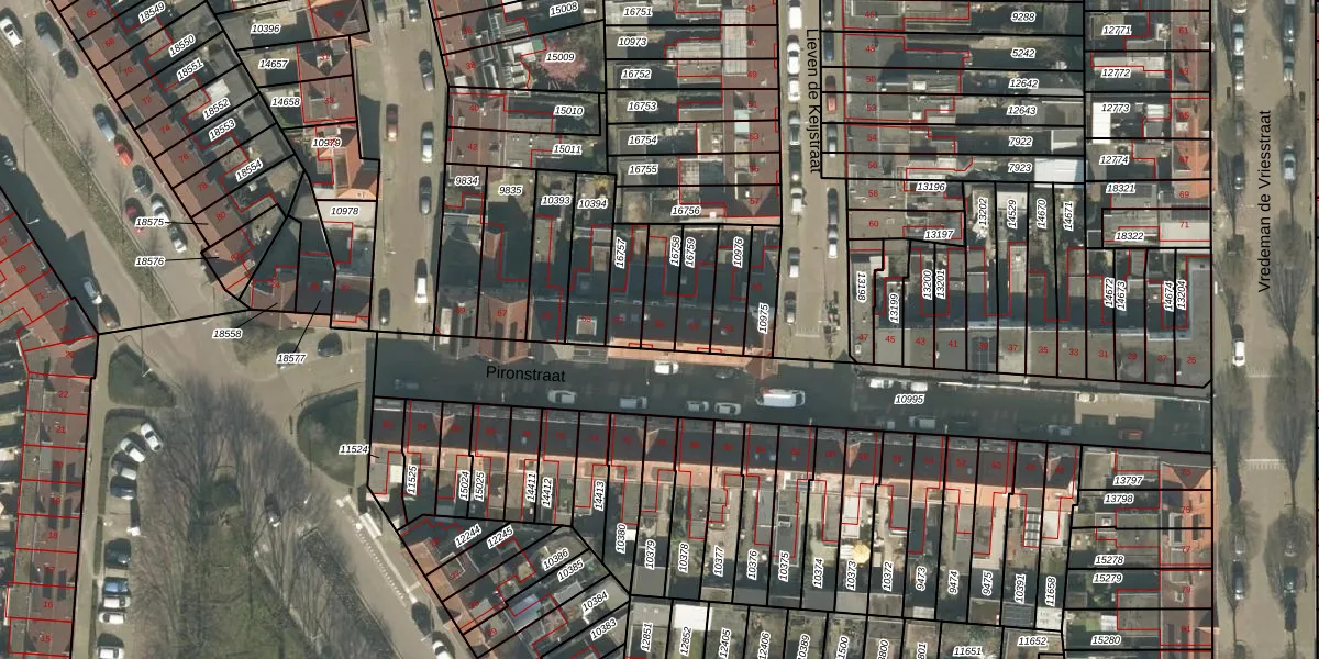 Het perceel waarop Pironstraat 55 staat heeft een oppervlakte van 99 m². Dit is een klein perceel. De perceeloppervlakte wordt geregistreerd door het Kadaster. Gedetailleerde informatie over de maten van dit perceel kunt u vinden in het rapport Kadastrale kaart met maatvoering van Pironstraat 55.