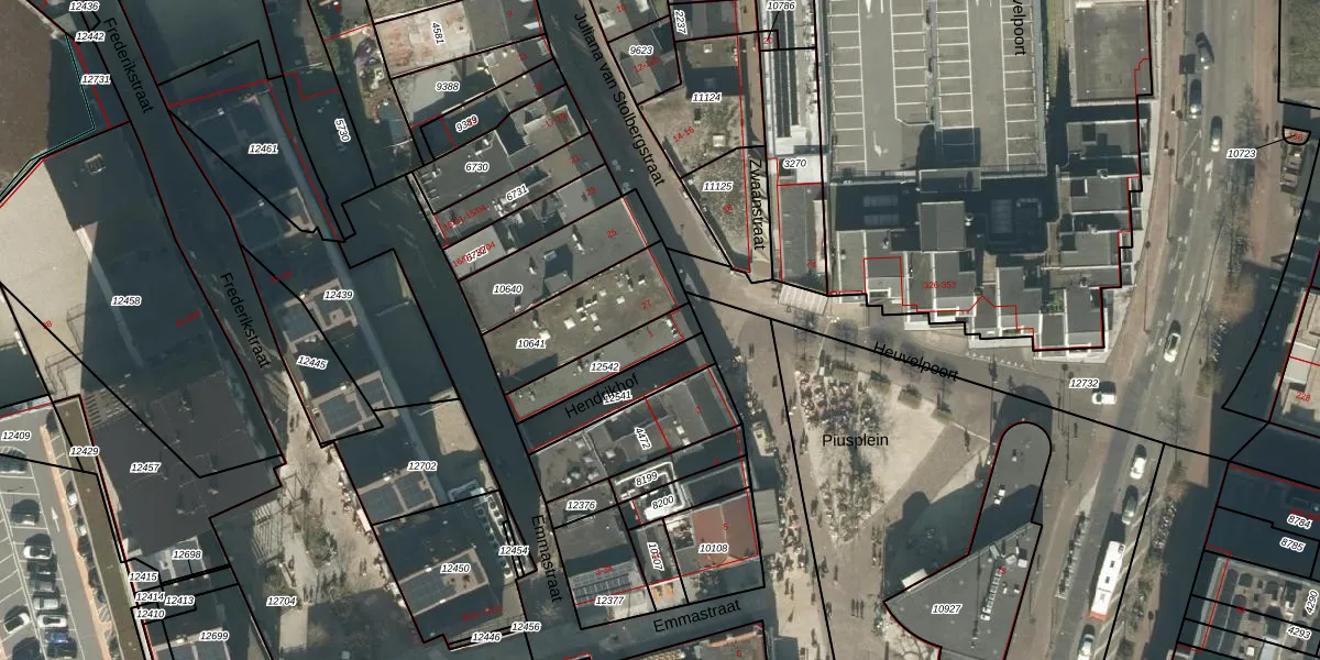 Piusplein 1 is gelegen op kadastraal perceel TBG01M12542. Deze kadastrale aanduiding is uniek en wordt gebruikt door het Kadaster om eigendomsrechten en andere zakelijke rechten vast te leggen. Het perceel maakt onderdeel uit van de kadastrale gemeente Tilburg.
