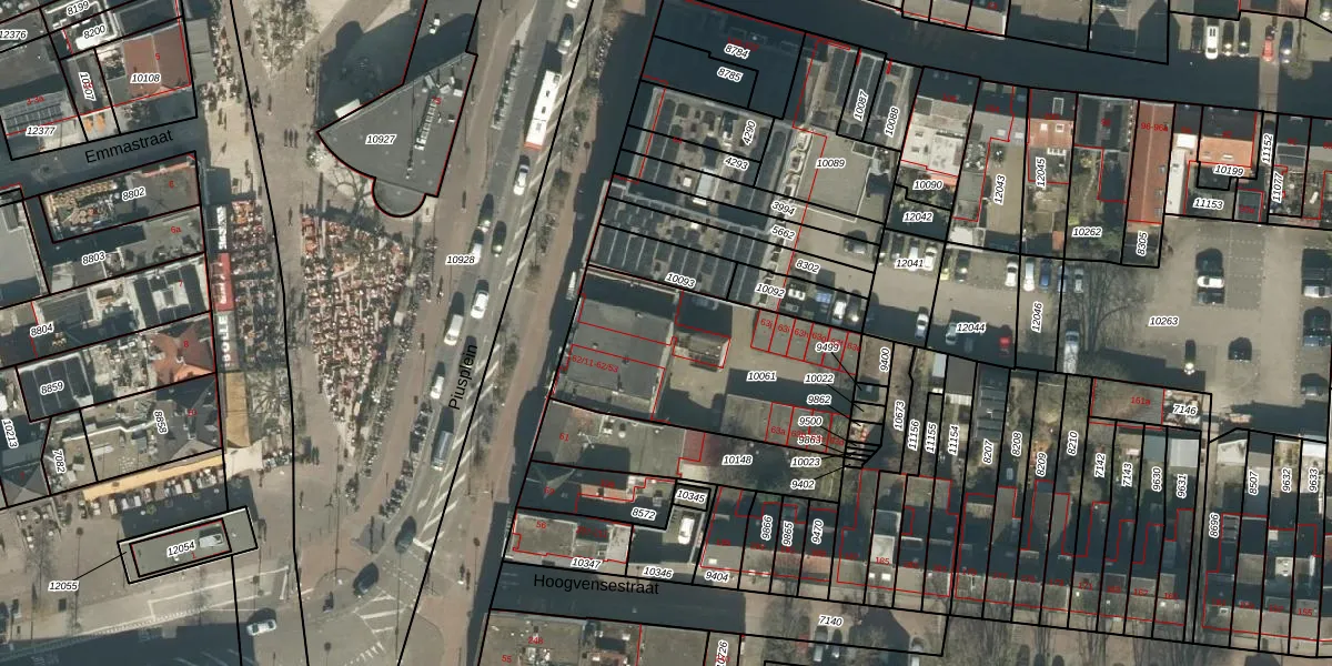 Piusplein 62-53 is gelegen op kadastraal perceel TBG01M10061. Deze kadastrale aanduiding is uniek en wordt gebruikt door het Kadaster om eigendomsrechten en andere zakelijke rechten vast te leggen. Het perceel maakt onderdeel uit van de kadastrale gemeente Tilburg.