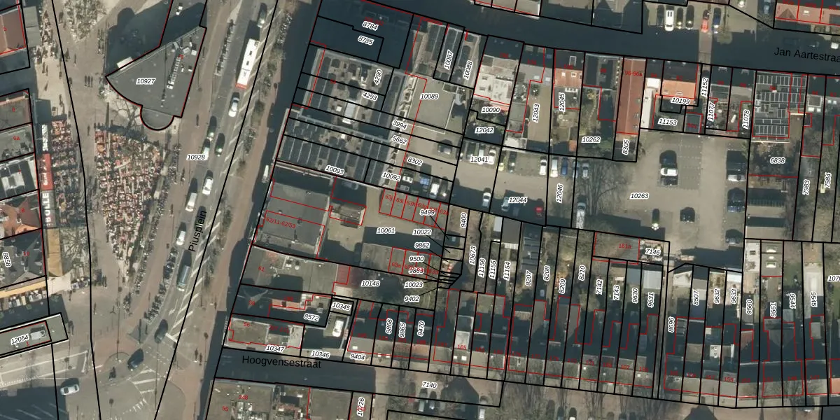 Het perceel waarop Piusplein 63-g staat heeft een oppervlakte van 878 m². Dit is een groot perceel. De perceeloppervlakte wordt geregistreerd door het Kadaster. Gedetailleerde informatie over de maten van dit perceel kunt u vinden in het rapport Kadastrale kaart met maatvoering van Piusplein 63-g.