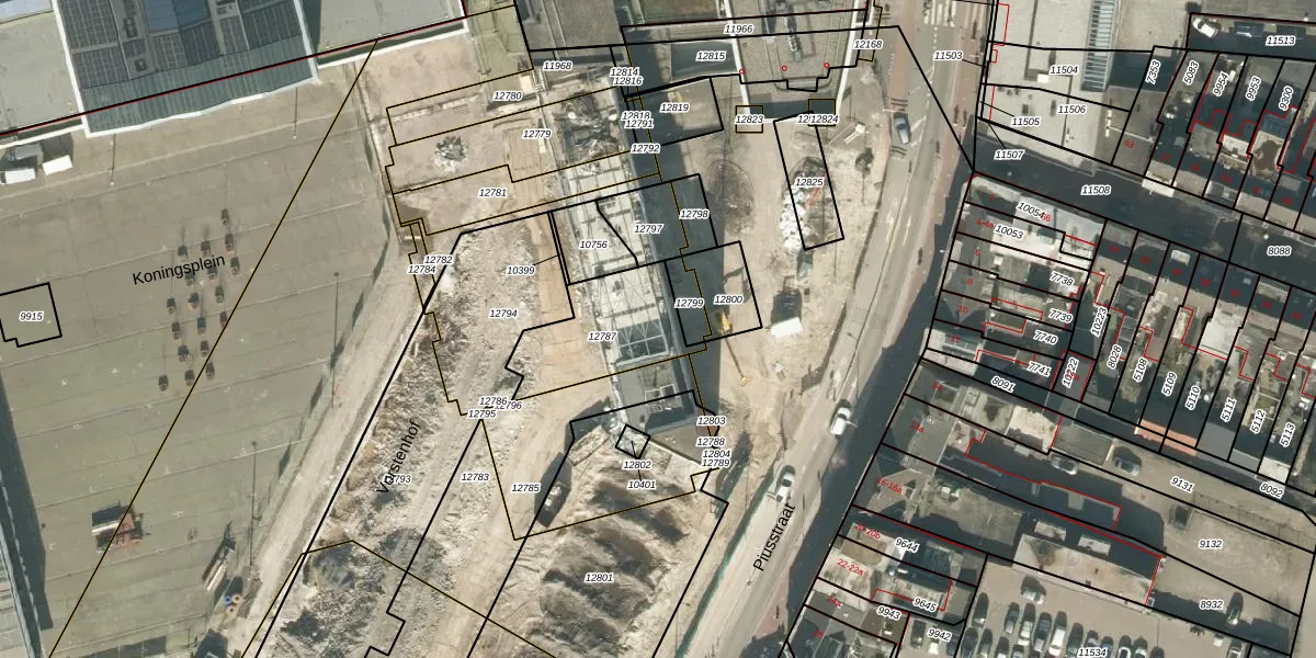 Het perceel waarop Piusstraat 13-f staat heeft een oppervlakte van 337 m². Dit is een groot perceel. De perceeloppervlakte wordt geregistreerd door het Kadaster. Gedetailleerde informatie over de maten van dit perceel kunt u vinden in het rapport Kadastrale kaart met maatvoering van Piusstraat 13-f.