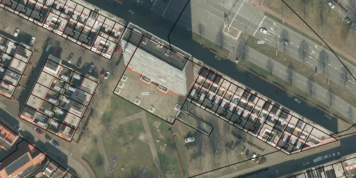 Het perceel waarop Rector Coppenserf 25 staat heeft een oppervlakte van 1506 m². Dit is een zeer groot perceel. De perceeloppervlakte wordt geregistreerd door het Kadaster. Gedetailleerde informatie over de maten van dit perceel kunt u vinden in het rapport Kadastrale kaart met maatvoering van Rector Coppenserf 25.