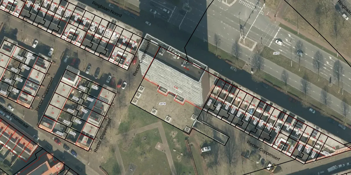 Het perceel waarop Rector Coppenserf 33 staat heeft een oppervlakte van 1506 m². Dit is een zeer groot perceel. De perceeloppervlakte wordt geregistreerd door het Kadaster. Gedetailleerde informatie over de maten van dit perceel kunt u vinden in het rapport Kadastrale kaart met maatvoering van Rector Coppenserf 33.