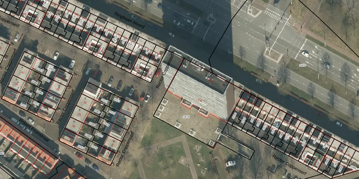 Het perceel waarop Rector Coppenserf 35 staat heeft een oppervlakte van 1506 m². Dit is een zeer groot perceel. De perceeloppervlakte wordt geregistreerd door het Kadaster. Gedetailleerde informatie over de maten van dit perceel kunt u vinden in het rapport Kadastrale kaart met maatvoering van Rector Coppenserf 35.