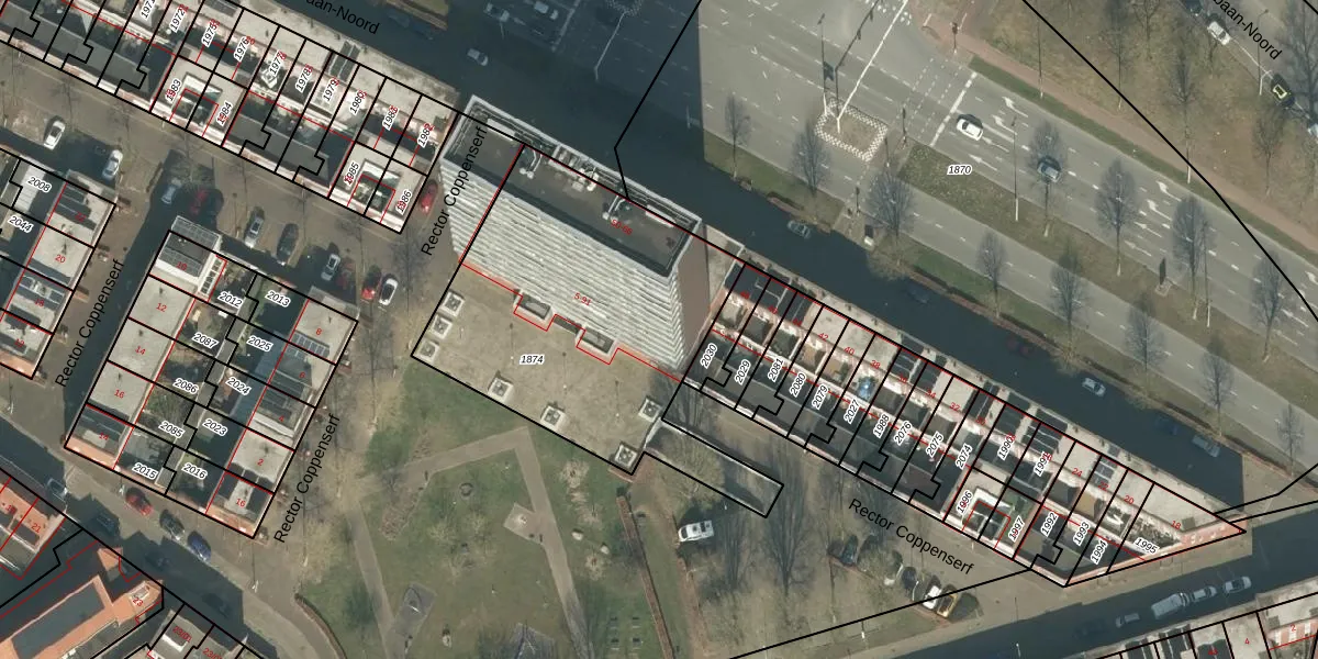 Het perceel waarop Rector Coppenserf 43 staat heeft een oppervlakte van 1506 m². Dit is een zeer groot perceel. De perceeloppervlakte wordt geregistreerd door het Kadaster. Gedetailleerde informatie over de maten van dit perceel kunt u vinden in het rapport Kadastrale kaart met maatvoering van Rector Coppenserf 43.