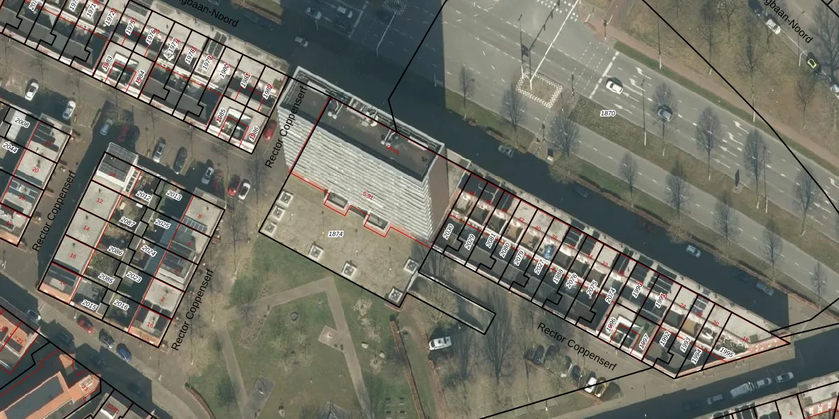 Het perceel waarop Rector Coppenserf 55 staat heeft een oppervlakte van 1506 m². Dit is een zeer groot perceel. De perceeloppervlakte wordt geregistreerd door het Kadaster. Gedetailleerde informatie over de maten van dit perceel kunt u vinden in het rapport Kadastrale kaart met maatvoering van Rector Coppenserf 55.