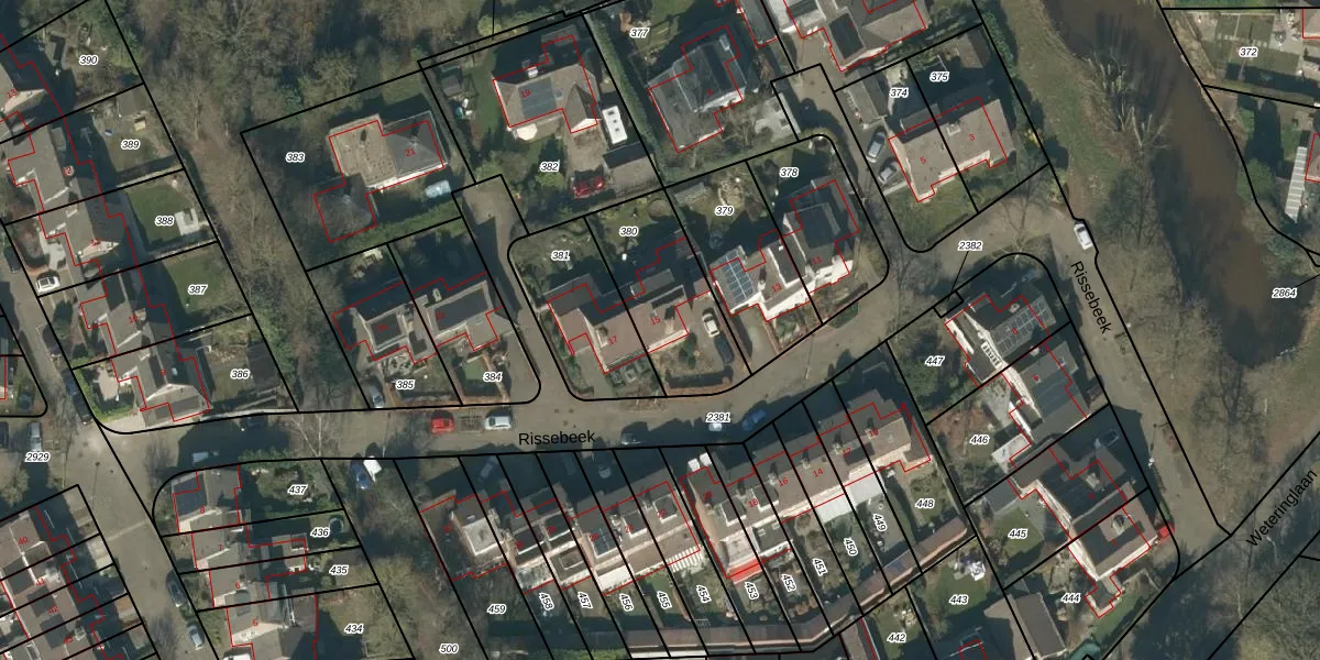 Het perceel waarop Rissebeek 15 staat heeft een oppervlakte van 407 m². Dit is een groot perceel. De perceeloppervlakte wordt geregistreerd door het Kadaster. Gedetailleerde informatie over de maten van dit perceel kunt u vinden in het rapport Kadastrale kaart met maatvoering van Rissebeek 15.