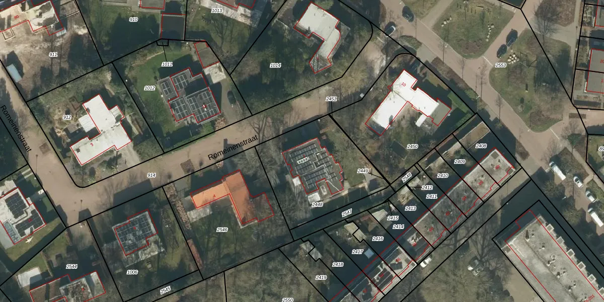 Het perceel waarop Romeinenstraat 2 staat heeft een oppervlakte van 942 m². Dit is een groot perceel. De perceeloppervlakte wordt geregistreerd door het Kadaster. Gedetailleerde informatie over de maten van dit perceel kunt u vinden in het rapport Kadastrale kaart met maatvoering van Romeinenstraat 2.