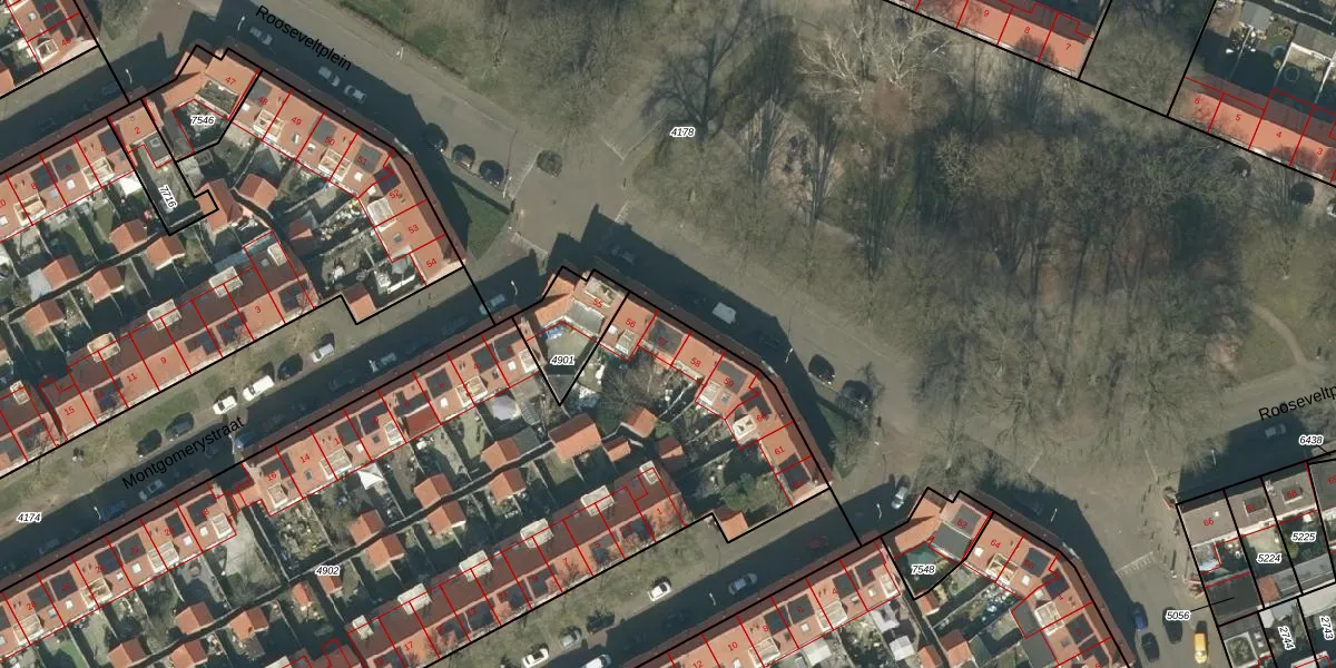 Het perceel waarop Rooseveltplein 57 staat heeft een oppervlakte van 4864 m². Dit is een zeer groot perceel. De perceeloppervlakte wordt geregistreerd door het Kadaster. Gedetailleerde informatie over de maten van dit perceel kunt u vinden in het rapport Kadastrale kaart met maatvoering van Rooseveltplein 57.
