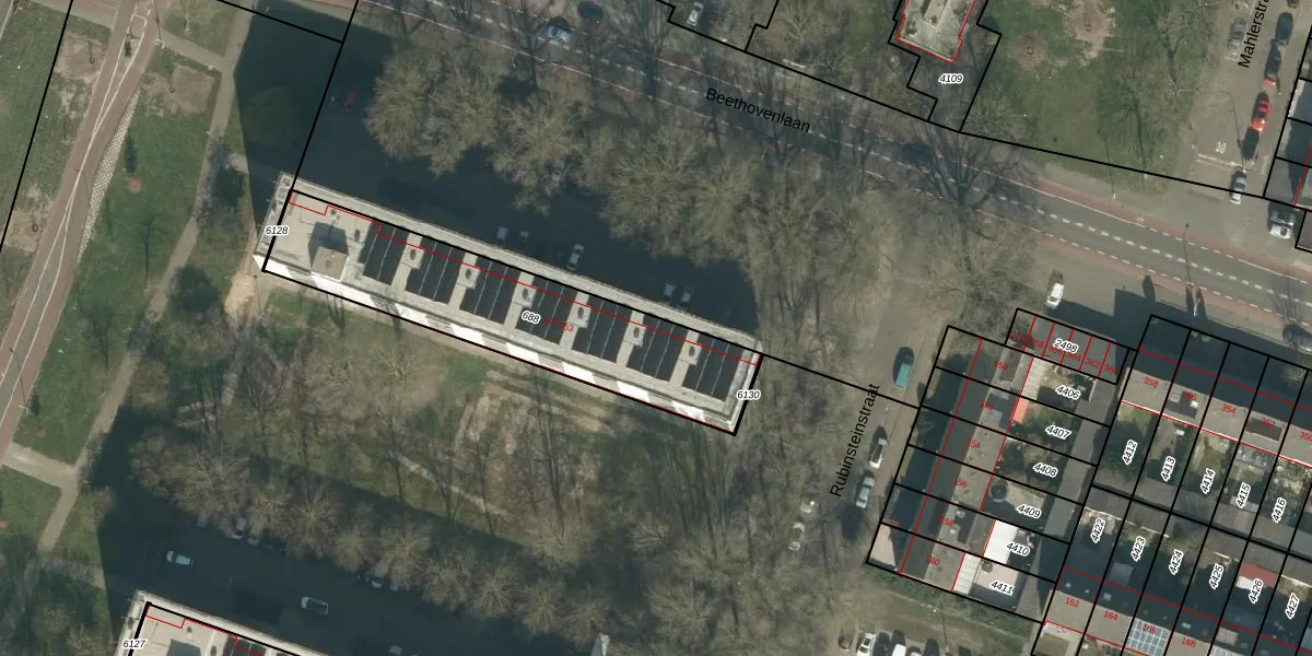 Het perceel waarop Rubinsteinstraat 155 staat heeft een oppervlakte van 977 m². Dit is een groot perceel. De perceeloppervlakte wordt geregistreerd door het Kadaster. Gedetailleerde informatie over de maten van dit perceel kunt u vinden in het rapport Kadastrale kaart met maatvoering van Rubinsteinstraat 155.