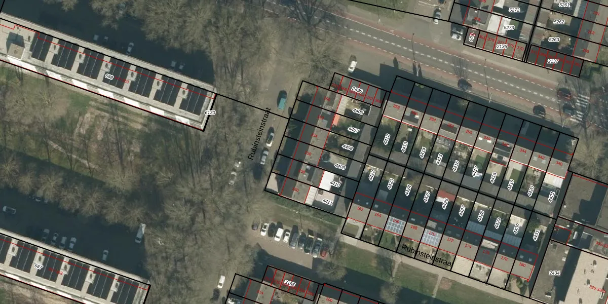 Rubinsteinstraat 156 is gelegen op kadastraal perceel TBG01S4409. Deze kadastrale aanduiding is uniek en wordt gebruikt door het Kadaster om eigendomsrechten en andere zakelijke rechten vast te leggen. Het perceel maakt onderdeel uit van de kadastrale gemeente Tilburg.