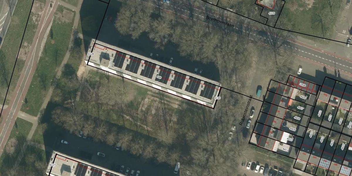 Het perceel waarop Rubinsteinstraat 217 staat heeft een oppervlakte van 977 m². Dit is een groot perceel. De perceeloppervlakte wordt geregistreerd door het Kadaster. Gedetailleerde informatie over de maten van dit perceel kunt u vinden in het rapport Kadastrale kaart met maatvoering van Rubinsteinstraat 217.