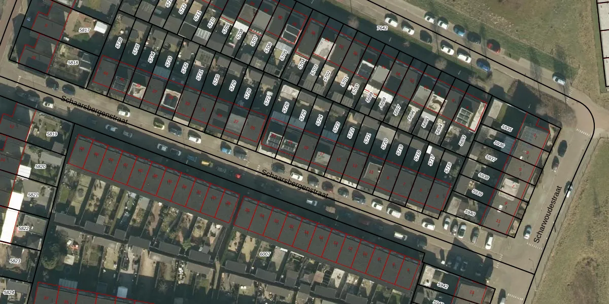 Schaarsbergenstraat 19 is gelegen op kadastraal perceel TBG01AG5724. Deze kadastrale aanduiding is uniek en wordt gebruikt door het Kadaster om eigendomsrechten en andere zakelijke rechten vast te leggen. Het perceel maakt onderdeel uit van de kadastrale gemeente Tilburg.