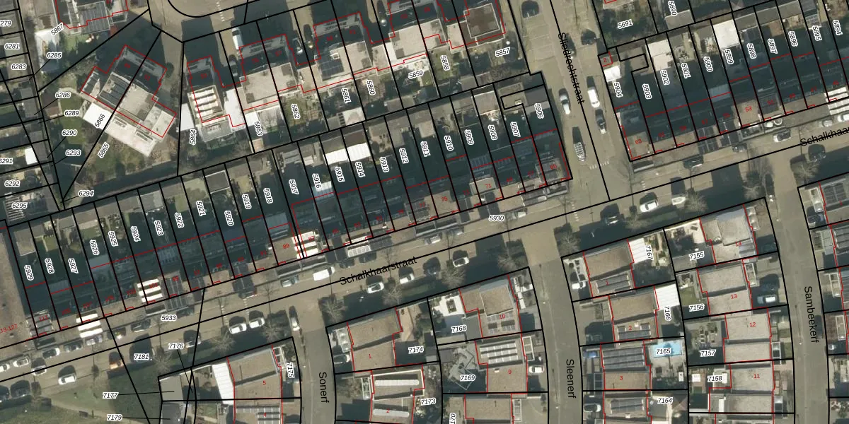 Schalkhaarstraat 77 is gelegen op kadastraal perceel TBG01AG5912. Deze kadastrale aanduiding is uniek en wordt gebruikt door het Kadaster om eigendomsrechten en andere zakelijke rechten vast te leggen. Het perceel maakt onderdeel uit van de kadastrale gemeente Tilburg.
