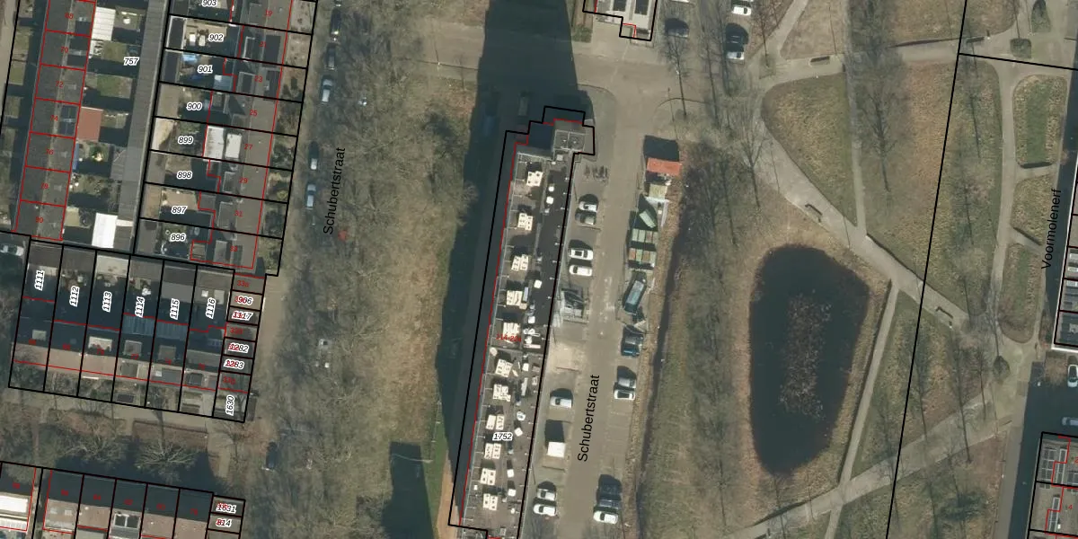 Het perceel waarop Schubertstraat 156 staat heeft een oppervlakte van 1043 m². Dit is een zeer groot perceel. De perceeloppervlakte wordt geregistreerd door het Kadaster. Gedetailleerde informatie over de maten van dit perceel kunt u vinden in het rapport Kadastrale kaart met maatvoering van Schubertstraat 156.