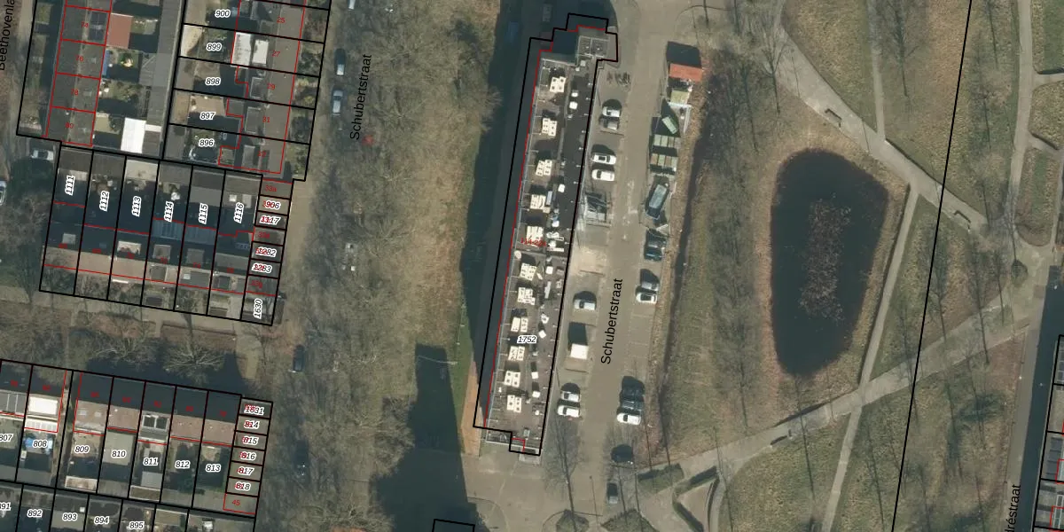 Het perceel waarop Schubertstraat 184 staat heeft een oppervlakte van 1043 m². Dit is een zeer groot perceel. De perceeloppervlakte wordt geregistreerd door het Kadaster. Gedetailleerde informatie over de maten van dit perceel kunt u vinden in het rapport Kadastrale kaart met maatvoering van Schubertstraat 184.