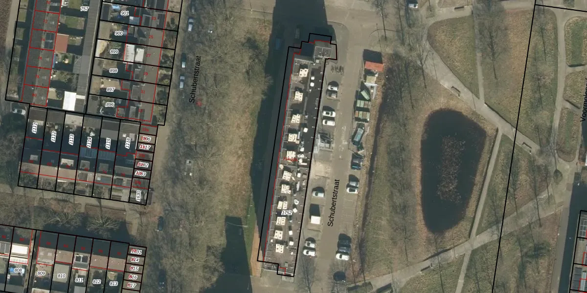 Het perceel waarop Schubertstraat 186 staat heeft een oppervlakte van 1043 m². Dit is een zeer groot perceel. De perceeloppervlakte wordt geregistreerd door het Kadaster. Gedetailleerde informatie over de maten van dit perceel kunt u vinden in het rapport Kadastrale kaart met maatvoering van Schubertstraat 186.