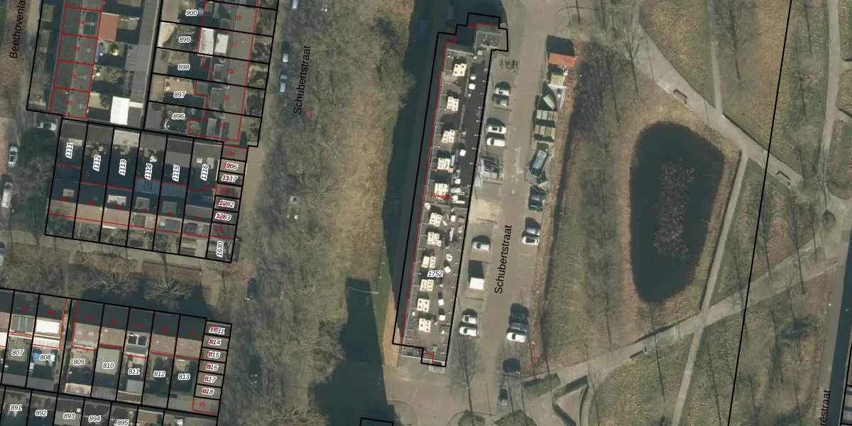 Het perceel waarop Schubertstraat 216 staat heeft een oppervlakte van 1043 m². Dit is een zeer groot perceel. De perceeloppervlakte wordt geregistreerd door het Kadaster. Gedetailleerde informatie over de maten van dit perceel kunt u vinden in het rapport Kadastrale kaart met maatvoering van Schubertstraat 216.