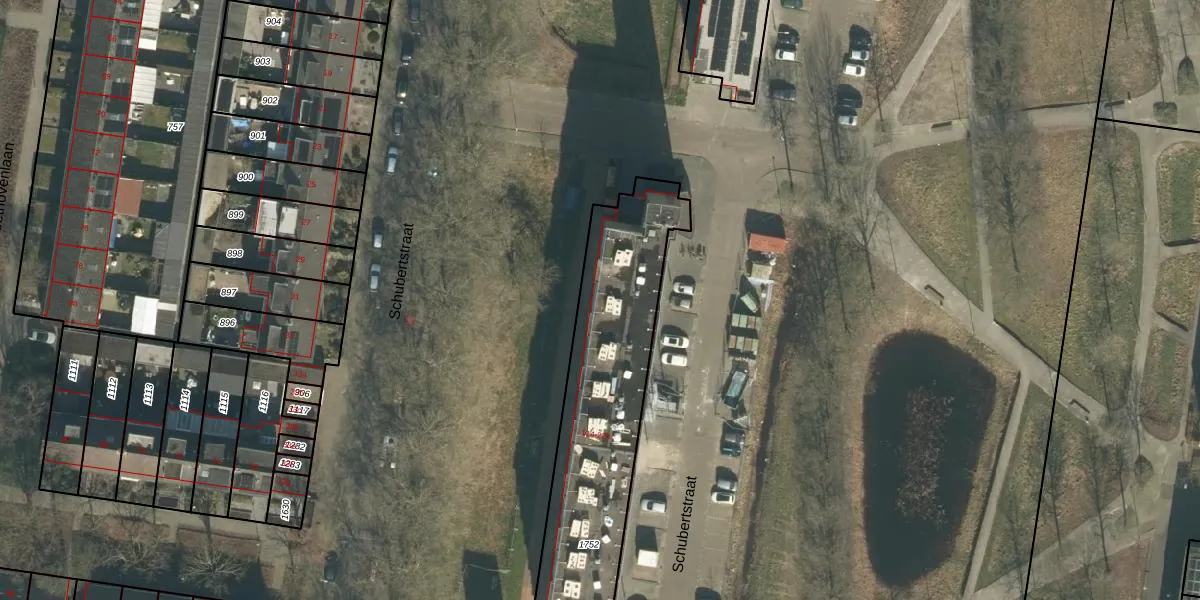 Het perceel waarop Schubertstraat 222 staat heeft een oppervlakte van 1043 m². Dit is een zeer groot perceel. De perceeloppervlakte wordt geregistreerd door het Kadaster. Gedetailleerde informatie over de maten van dit perceel kunt u vinden in het rapport Kadastrale kaart met maatvoering van Schubertstraat 222.