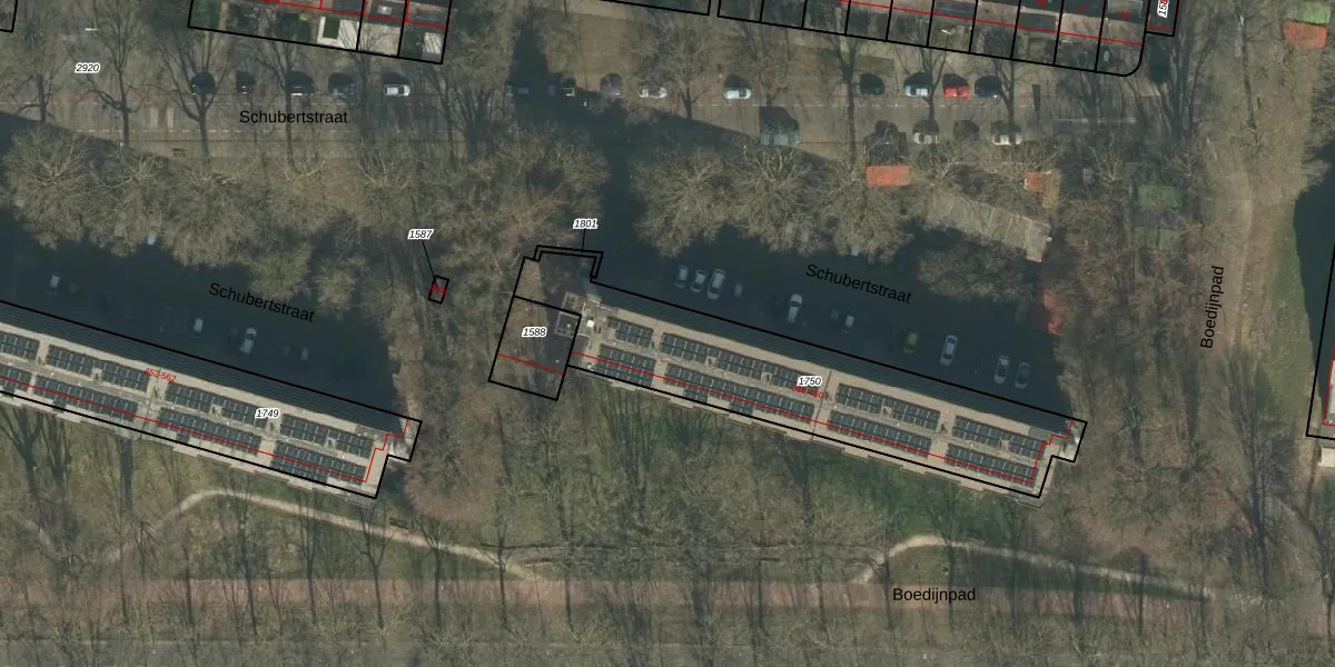 Het perceel waarop Schubertstraat 384 staat heeft een oppervlakte van 1058 m². Dit is een zeer groot perceel. De perceeloppervlakte wordt geregistreerd door het Kadaster. Gedetailleerde informatie over de maten van dit perceel kunt u vinden in het rapport Kadastrale kaart met maatvoering van Schubertstraat 384.