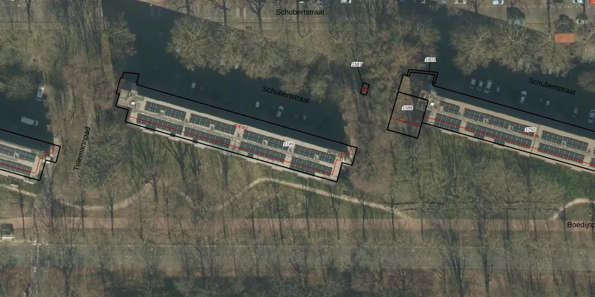 Het perceel waarop Schubertstraat 512 staat heeft een oppervlakte van 1040 m². Dit is een zeer groot perceel. De perceeloppervlakte wordt geregistreerd door het Kadaster. Gedetailleerde informatie over de maten van dit perceel kunt u vinden in het rapport Kadastrale kaart met maatvoering van Schubertstraat 512.
