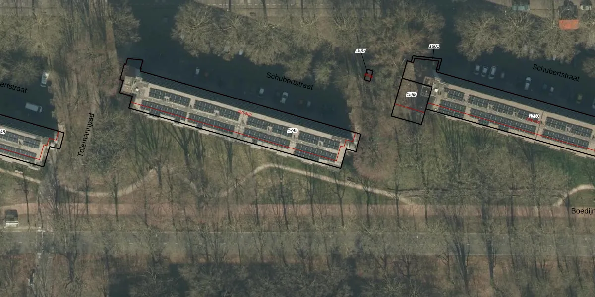 Het perceel waarop Schubertstraat 550 staat heeft een oppervlakte van 1040 m². Dit is een zeer groot perceel. De perceeloppervlakte wordt geregistreerd door het Kadaster. Gedetailleerde informatie over de maten van dit perceel kunt u vinden in het rapport Kadastrale kaart met maatvoering van Schubertstraat 550.