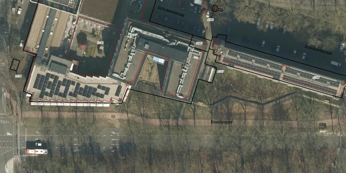 Het perceel waarop Schubertstraat 700-418 staat heeft een oppervlakte van 6095 m². Dit is een zeer groot perceel. De perceeloppervlakte wordt geregistreerd door het Kadaster. Gedetailleerde informatie over de maten van dit perceel kunt u vinden in het rapport Kadastrale kaart met maatvoering van Schubertstraat 700-418.