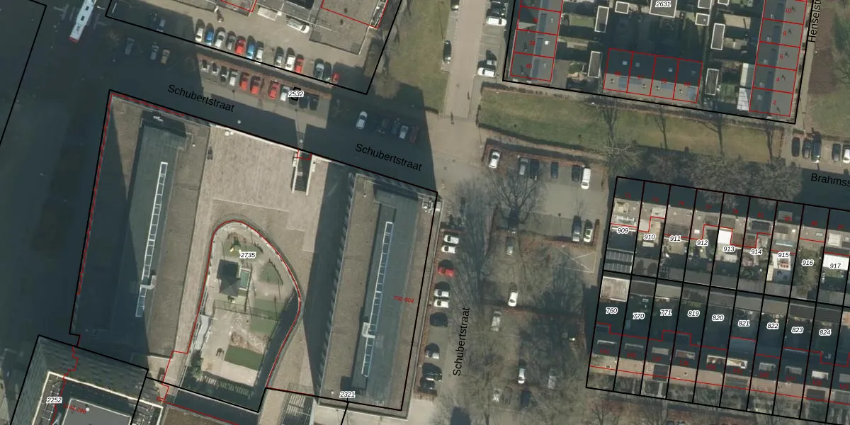 Het perceel waarop Schubertstraat 700-k staat heeft een oppervlakte van 4690 m². Dit is een zeer groot perceel. De perceeloppervlakte wordt geregistreerd door het Kadaster. Gedetailleerde informatie over de maten van dit perceel kunt u vinden in het rapport Kadastrale kaart met maatvoering van Schubertstraat 700-k.