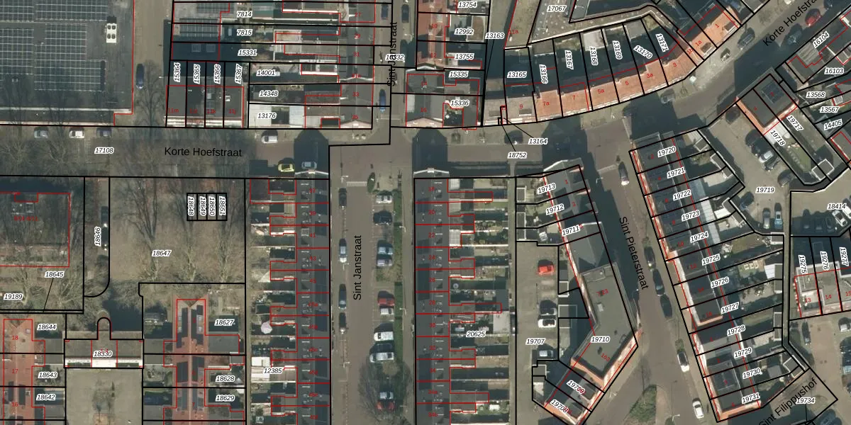 Het perceel waarop Sint Janstraat 20 staat heeft een oppervlakte van 1644 m². Dit is een zeer groot perceel. De perceeloppervlakte wordt geregistreerd door het Kadaster. Gedetailleerde informatie over de maten van dit perceel kunt u vinden in het rapport Kadastrale kaart met maatvoering van Sint Janstraat 20.