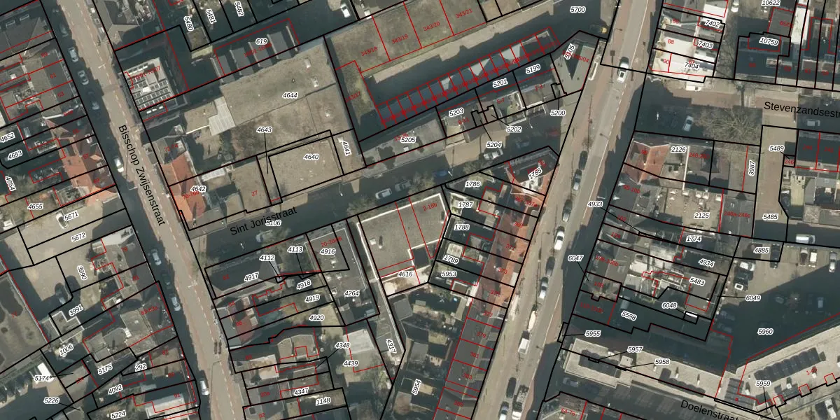 Het perceel waarop Sint Jorisstraat 2-a staat heeft een oppervlakte van 366 m². Dit is een groot perceel. De perceeloppervlakte wordt geregistreerd door het Kadaster. Gedetailleerde informatie over de maten van dit perceel kunt u vinden in het rapport Kadastrale kaart met maatvoering van Sint Jorisstraat 2-a.