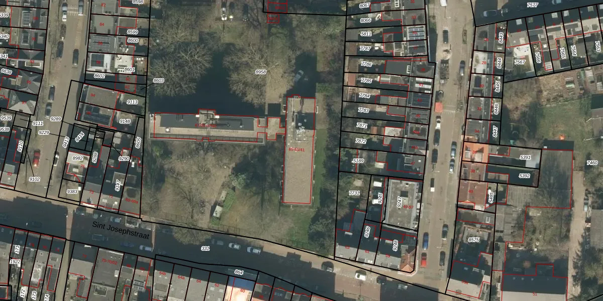 Het perceel waarop Sint Josephstraat 65-25 staat heeft een oppervlakte van 5766 m². Dit is een zeer groot perceel. De perceeloppervlakte wordt geregistreerd door het Kadaster. Gedetailleerde informatie over de maten van dit perceel kunt u vinden in het rapport Kadastrale kaart met maatvoering van Sint Josephstraat 65-25.