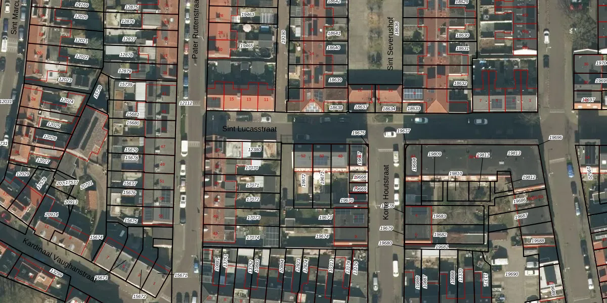 Sint Lucasstraat 52 is gelegen op kadastraal perceel TBG01N19672. Deze kadastrale aanduiding is uniek en wordt gebruikt door het Kadaster om eigendomsrechten en andere zakelijke rechten vast te leggen. Het perceel maakt onderdeel uit van de kadastrale gemeente Tilburg.