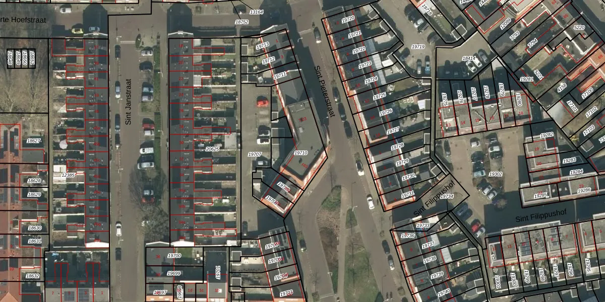 Sint Pieterstraat 13 is gelegen op kadastraal perceel TBG01N19710. Deze kadastrale aanduiding is uniek en wordt gebruikt door het Kadaster om eigendomsrechten en andere zakelijke rechten vast te leggen. Het perceel maakt onderdeel uit van de kadastrale gemeente Tilburg.