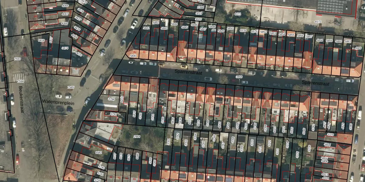 Sparrenstraat 38 is gelegen op kadastraal perceel TBG01P5636. Deze kadastrale aanduiding is uniek en wordt gebruikt door het Kadaster om eigendomsrechten en andere zakelijke rechten vast te leggen. Het perceel maakt onderdeel uit van de kadastrale gemeente Tilburg.