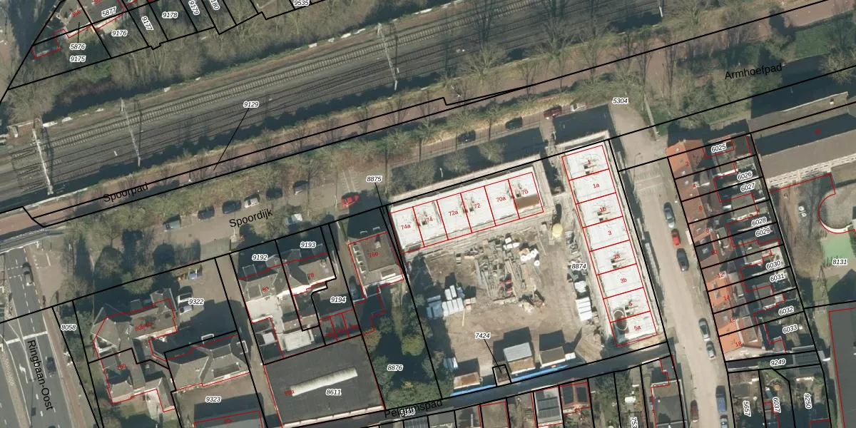 Het perceel waarop Spoordijk 74 staat heeft een oppervlakte van 2615 m². Dit is een zeer groot perceel. De perceeloppervlakte wordt geregistreerd door het Kadaster. Gedetailleerde informatie over de maten van dit perceel kunt u vinden in het rapport Kadastrale kaart met maatvoering van Spoordijk 74.