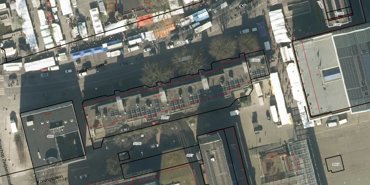 Het perceel waarop Stadhuisplein 99 staat heeft een oppervlakte van 2045 m². Dit is een zeer groot perceel. De perceeloppervlakte wordt geregistreerd door het Kadaster. Gedetailleerde informatie over de maten van dit perceel kunt u vinden in het rapport Kadastrale kaart met maatvoering van Stadhuisplein 99.