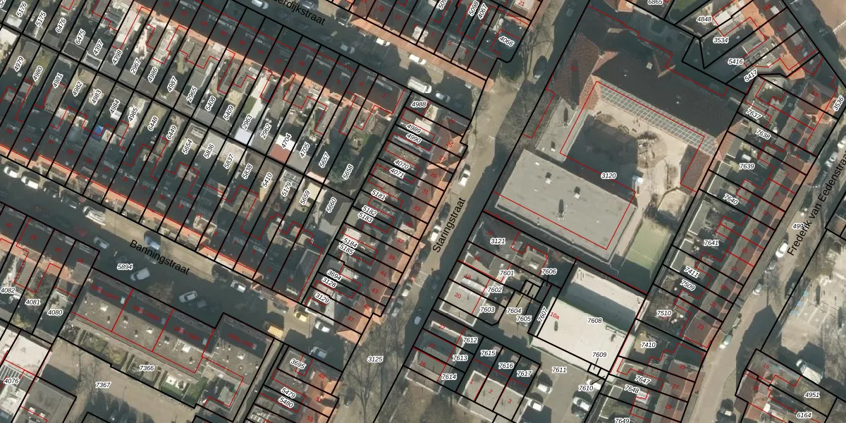 Staringstraat 33 is gelegen op kadastraal perceel TBG01Q5181. Deze kadastrale aanduiding is uniek en wordt gebruikt door het Kadaster om eigendomsrechten en andere zakelijke rechten vast te leggen. Het perceel maakt onderdeel uit van de kadastrale gemeente Tilburg.