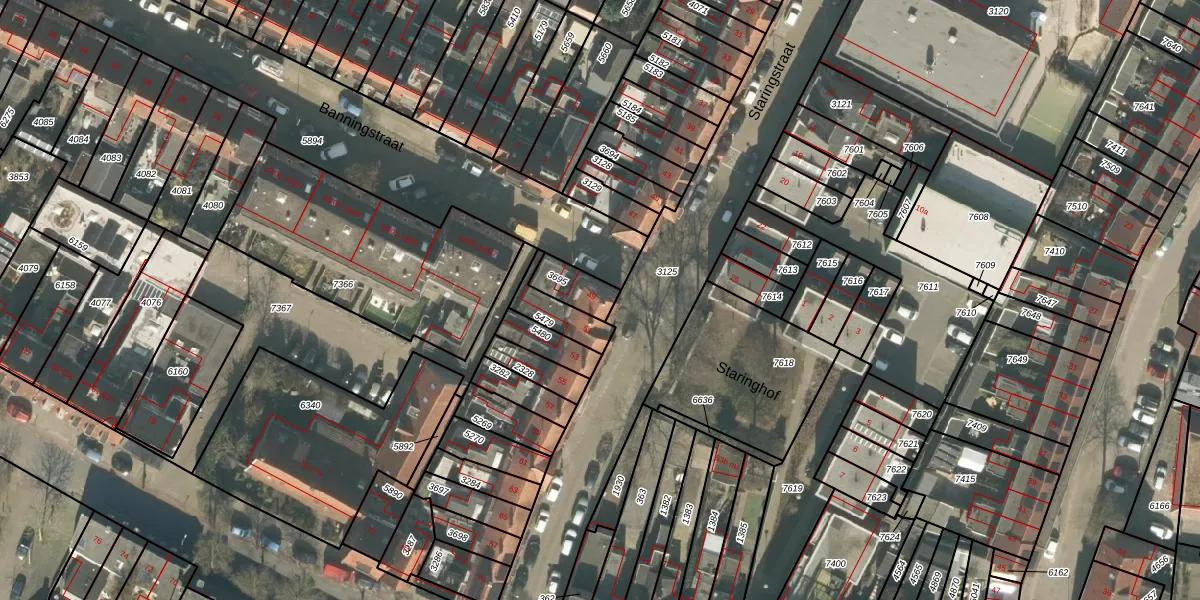 Het perceel waarop Staringstraat 49 staat heeft een oppervlakte van 88 m². Dit is een klein perceel. De perceeloppervlakte wordt geregistreerd door het Kadaster. Gedetailleerde informatie over de maten van dit perceel kunt u vinden in het rapport Kadastrale kaart met maatvoering van Staringstraat 49.