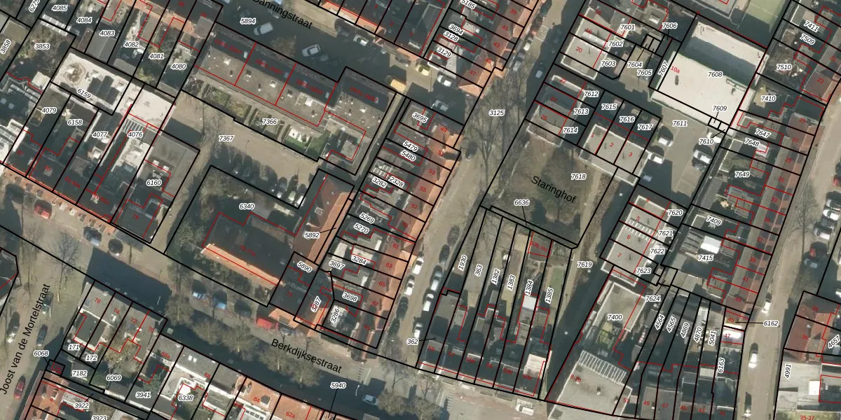 Het perceel waarop Staringstraat 57 staat heeft een oppervlakte van 81 m². Dit is een klein perceel. De perceeloppervlakte wordt geregistreerd door het Kadaster. Gedetailleerde informatie over de maten van dit perceel kunt u vinden in het rapport Kadastrale kaart met maatvoering van Staringstraat 57.