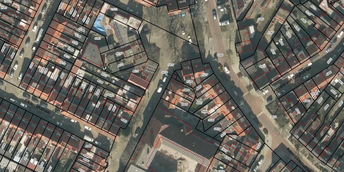 Gebruik de zoekbalk of klik op een perceel voor informatie over de adressen binnen dit perceel.